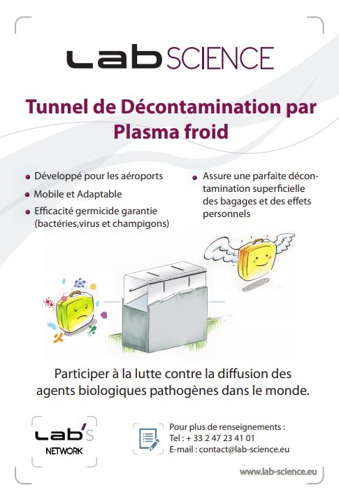 Développé pour les aéroports, ce tunnel a pour spécificité d’assurer une décontamination parfaite de l’ensemble des surfaces des bagages et des effets personnels. Alliant rapidité et performance éprouvée, le tunnel de décontamination plasma développé par Lab’Science correspond parfaitement aux contraintes liées aux points d’inspection frontière. Les boucles de contamination sont rompues et les surfaces des bannettes et des bagages exemptes de toute souche de SARS-CoV2 et d’autres micro-organismes pathogènes. Le personnel de l’aéroport, des compagnies aériennes et les voyageurs sont rassurés.